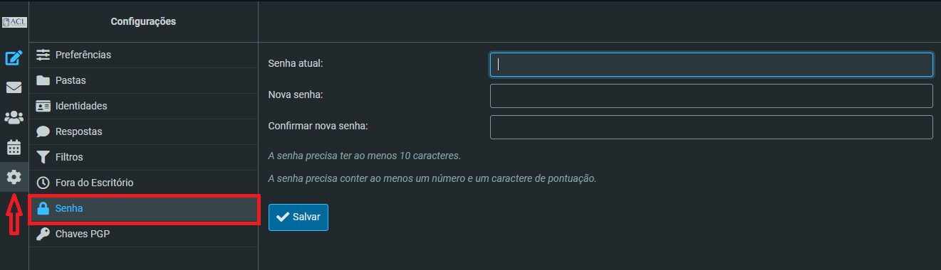 No Painel de Opções do WebMail clique no menu Configurações. Dentro do Menu Configurações, acesse a opção Senha. Insira a senha atual e a nova senha conforme imagem abaixo.