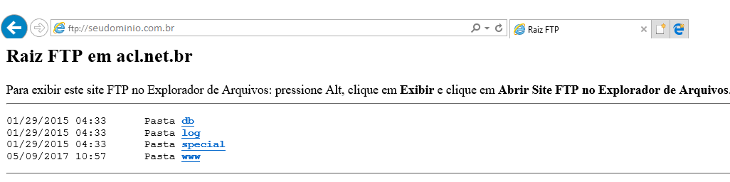 Para acessar a Área FTP de seu site, através de seu navegador de internet (Internet Explorer, Google Chrome, Mozilla Firefox, etc).