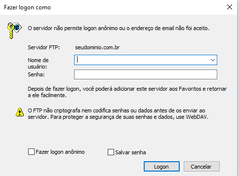 Para acessar a Área FTP de seu site, através de seu navegador de internet (Internet Explorer,...